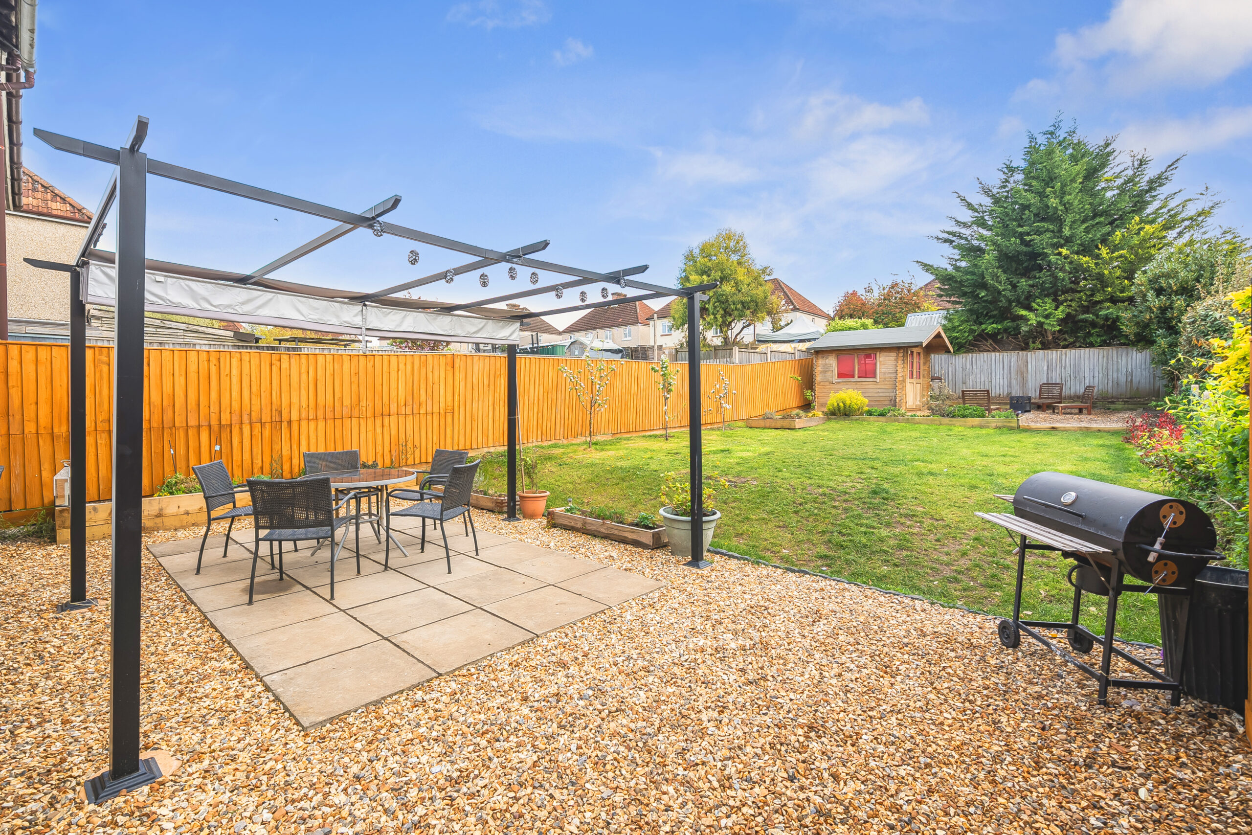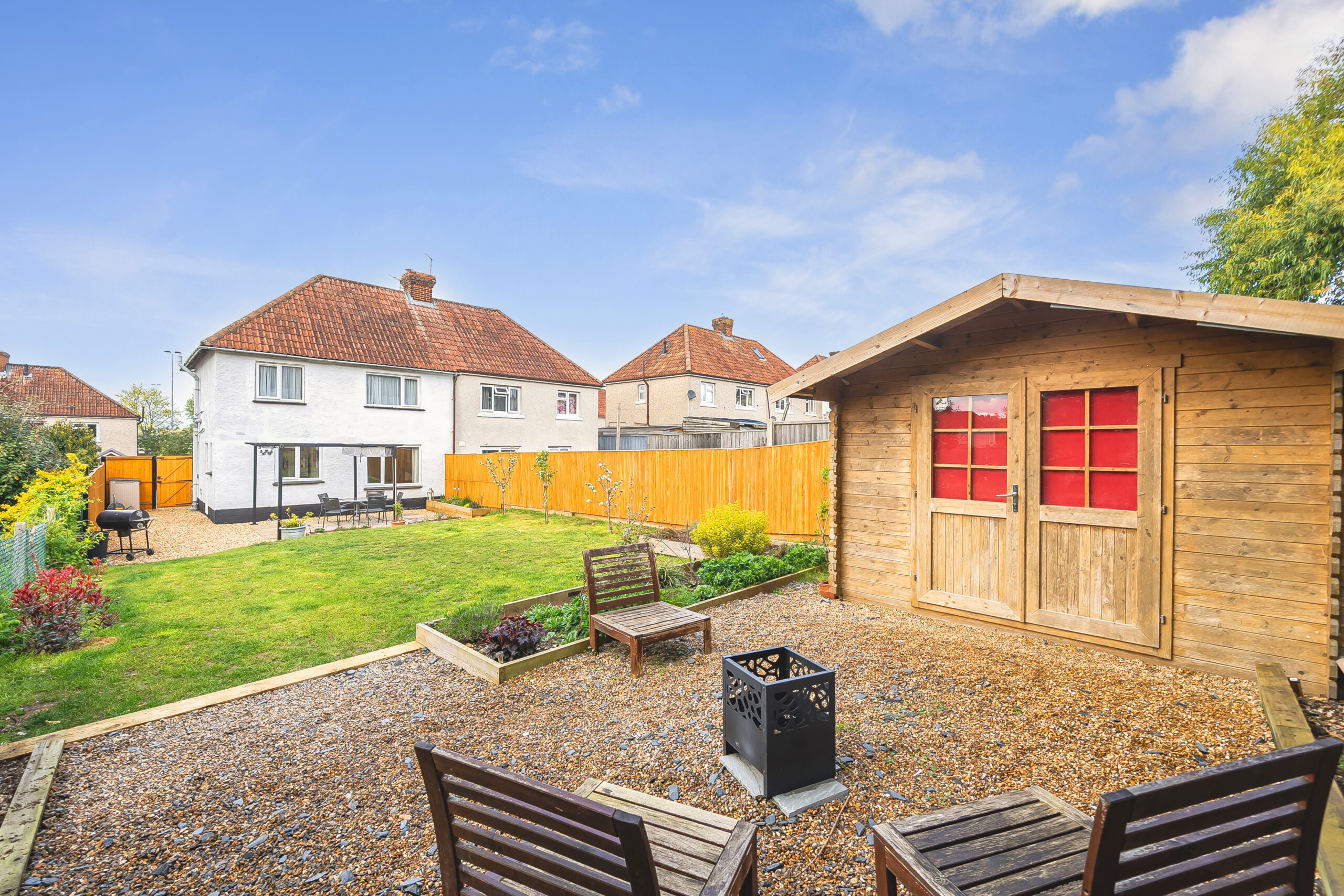 To the front of the property is a large driveway with off road parking for several cars, raised flower border and gated access leads to the rear garden. The rear garden is a great size space and south facing for the sun lovers! A large patio abuts the rear of the property with pergola over. The garden is enclosed by timber fencing, to the rear of the garden is a Dunster timber home office with further patio area. Raised timber borders for flower beds and laid lawn.